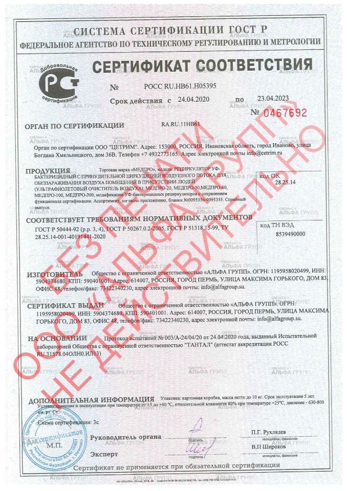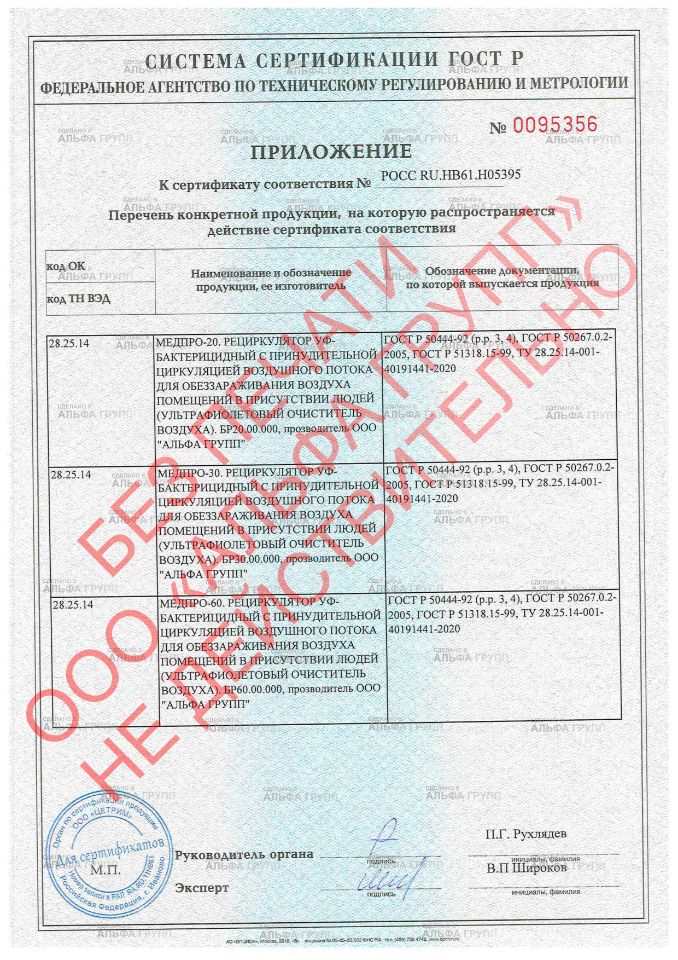ПРОДУКЦИЯ: Торговая марка «МЕДПРО», модели: РЕЦИРКУЛЯТОР УФ-БАКТЕРИЦИДНЫЙ С ПРИНУДИТЕЛЬНОЙ ЦИРКУЛЯЦИЕЙ ВОЗДУШНОГО ПОТОКА ДЛЯ ОБЕЗЗАРАЖИВАНИЯ ВОЗДУХА ПОМЕЩЕНИЙ В ПРИСУТСТВИИ ЛЮДЕЙ (УЛЬТРАФИОЛЕТОВЫЙ ОЧИСТИТЕЛЬ ВОЗДУХА): МЕДПРО-20, МЕДПРО-25, МЕДПРО-30, МЕДПРО-35, МЕДПРО-60, МЕДПРО-100, МЕДПРО-150, МЕДПРО-200, модификации УФ-бактерицидных рециркуляторов с сохранением функционала сертификации.